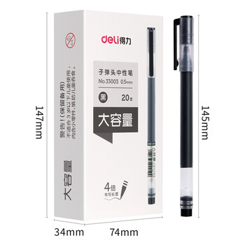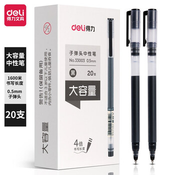 • 得力(deli)大容量中性笔4倍书写 大容量签字笔办公文具巨能写 0.5mm子弹头20支/盒DL-33003黑