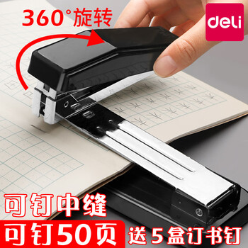 得力(deli) 可旋转订书机学生用大号钉书机多功能办公用订书器家用定厚书省力重型加厚订中缝起订装订 360°旋转可订50页【蓝】+5盒共2500枚钉